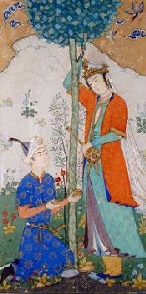 Tamerlane completed the conquest of Persia (1387). This began the rule of the Timurids or Timurid dynasty. There was terrible death and distruction. At Isfahan alone thee Mongols killed over 70,000 people, making mounds of severed heads. The Timurids were thus a foreign, non-Persian Sunni Muslim dynasty. At high point, the Timurids controlled all of Central Asia, Iran and modern Afghanistan, as well as large parts of Mesopotamia and the Caucasus. Tamarlane located his capital at Samarkand. He commissioned artists, calligraphers, writers, philosophers, astronomers and mathematicians, from all parts of his empire. He drew these artyisans and scholars especially from Shiraz and Isfahan. Tamerlane thus brought culture and civilization to Samarkand, Bukhara, Herat, Balkh and Mashad. The Timurid prince Zahir ud-Din Babur, the ruler of Ferghana, invaded India and founded the Mughal Empire (16th century). Shah Rukh (1405-1447) and Oleg Begh promoted art and culture throughout Persia. The tradition of miniature painting and book illumintion reached its heighth at Shiraz and Herat. The Mongol invasion devestated Persian cities and the major culture of Persian culture. This had the impact of opening Persia to cultural influences from Central Asia and China. One of the results was a rare pictoral insight into the Muslim world. Koranic criticim of pictorl depections has meant that painting has not been an important art form in the Muslim world. Thus from the 7th century until the invention of photography, we have relatively few pictoral depictiond from the Muslim world. One of the few exceptions are the minatures and book illustrations from the Timurid Dynasty.