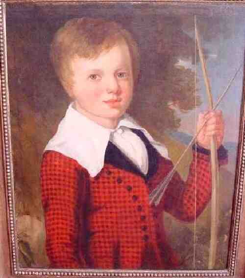 ![]() Figure 1.--This unattributed painting has been dated to the 1830s. It is proably English. Note the large, but soft collar. It is buttoned, but not worn with a bow. Also note the bright patterened jacket. |