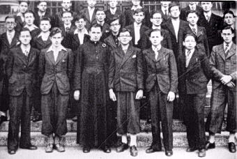 We note a wide range of outfits worn bybItakian boys during the 1930s. Rompers might be worn by younger boys in fashionable families, although we are unsure when they first appeared. Sandals appear to have been especially popular. School photographs can be a useful indicator of clothing styles. Many boys went barefoot, especially in rural areas and the south. Some boys in primary school wore smocks, but there were no uniforms in secondary schools. We note that boys entering Gynasio (secondary school) mostly wear short pannts. These would have been boys about 12 years old. A gynasio (secondary school) is not a good cross section of the Italian population, but rather would have been made up of the more affluent families--mostly middle class families. This photograph was taken in 1934-35 at Ginasio Parini in Milan. We note a few boyswearing sailor sits, but not very many. Only a few boys wear kneesocks, but this was presumably seasonal. Many boys wear suits, but it was apparently not required. There are boys with ties and open collar shirts.