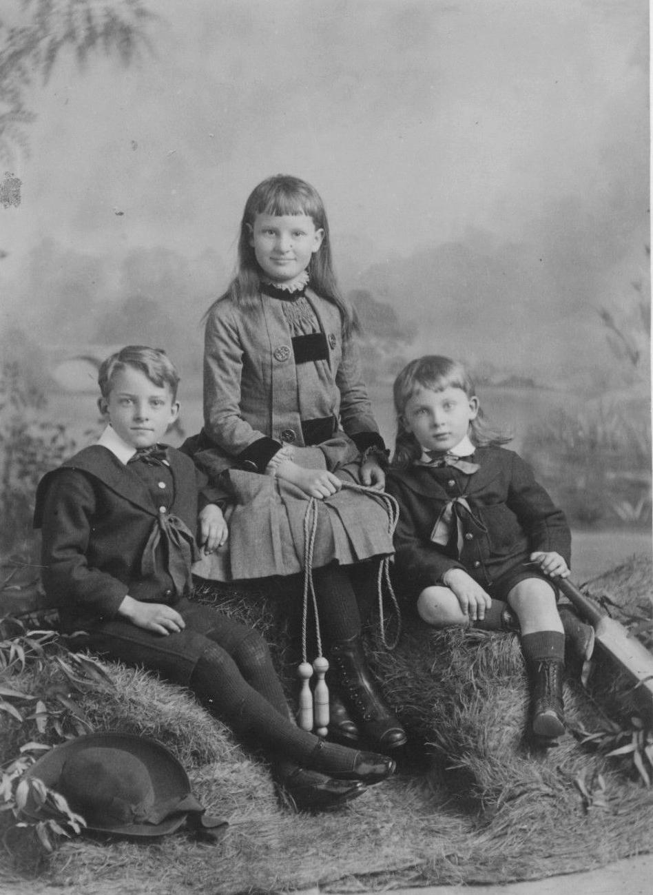 We know a little about individual Australian garments during the 1890s. We don't have much information on headwear yet. Note the wide-brimmed hat with streamers at the bottom of the portrait here (figure 1). We think it was for one of the boys. They likely had the same hats. Sailor suits were very popular in Australia during the 1890s. There were many different styles. Generally they had stripe detailing. One has to look twice here to see that the boys here are wearing sailor suits. We are not sure about the age conventions, but we think they were worn by younger boys to about 10 years of age. There were many different style. We also note Little Lord Fauntleroy suits. Older boys wore standard suits. There were several types of suits. Lapel jackets were the most common. There were oftem three-piece suits with vests. Children of similar ages might be dressed in identical outdits as we see here. The suits were worn with various collars. Eton collars were popular, but there were several other styles of detachable collars such as wing collars like the older boy on the previous page is wearing. This was more of a teenage or adult collar style. Most boys wore knee pants. Boys for casual wear or to school would often go barefoot. This was one of the few differences with England. When dressing up they would wear long stockings. Black long stockings were very prevalent. Younger boys might wear socks. High-top shoes were common.