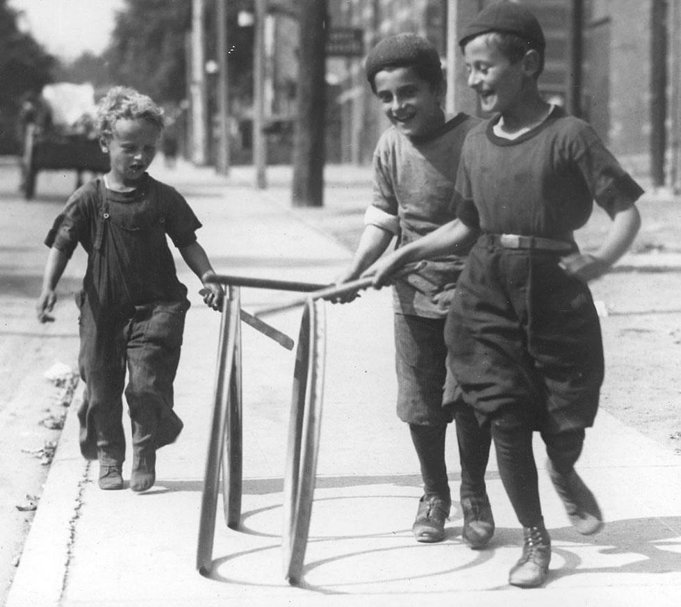 We notice the same toys in Canada that we see in America and Britain. Most toys were primarily for indoor play, blocks, board games, dolls, marbels, models, play sets like doll houses, puppets, toy animals, guns, soldiers, and vehicles. Of course indoor photiogtaphy was complicated. You needed flashbulbs which were not readily availabkle for snapshots until the 1950s. There were also outdoor toys, balls being the most imoportant, but kites were also popular. A very important outdoor toy was the hoop. Actually this was a toy almost every boy had because they were so common. Barrells until the 20th century were a major way of transporting many products from pickels to flour. Barrels were constructed of wooden staves bound by wooden or by the 19th century metal hoops. The they were manufactured in huge numbers. They were thus easily acceable and made for perfect play hoops.