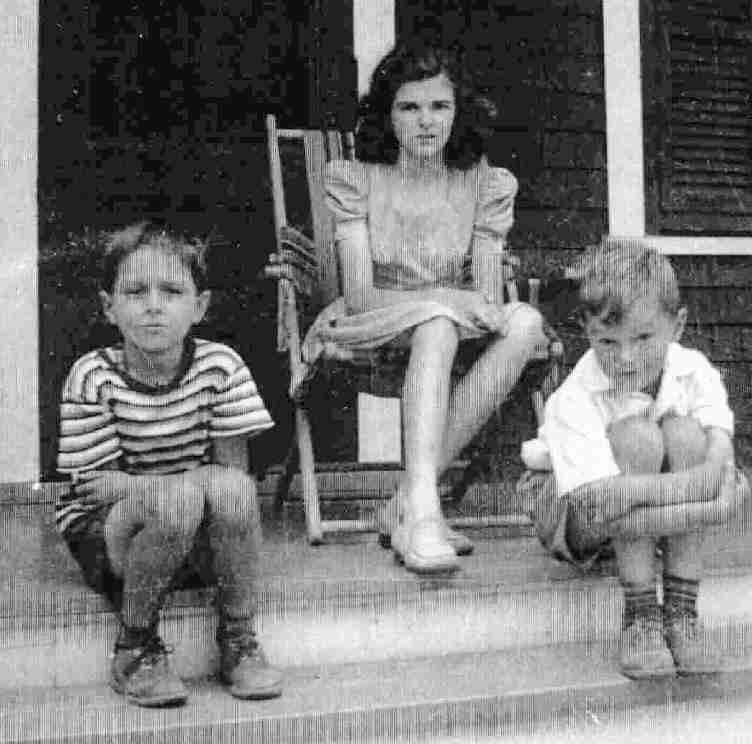 Here we see two French Canadian boys in a family snapshot taken during World War II about 1944 (figure 1). Both boys who look to be about 4-7 years old wear short pants for the Summer, one with a striped T-shirt, the other with a collared shirt. The clothing is indistinguible from American styles. A Canadian reader recalls wearing T-shirts and short pants during the Summer. He also had short pants suits which he wore with both knees socks as well as long stockings. A reader writes, "You can see myself at left and my older brother with whom I was always fighting. A cousin is seated. She is like a conentration camp inmate but she was only anorexic. If you look closely you will see that under my T-shirt, I wear suspenders for holding up my short pants. During the autum, my mother added garters to the waist belt connected with the suspender for long stockings and during the winter I wore longjohns under the stockings. It was an outfit nearly the same as my father and my grandfather wore when kids. But I was at the end of this chain because 10 years after kids like me began to wear breeches at 6 and long pants at 10-11."