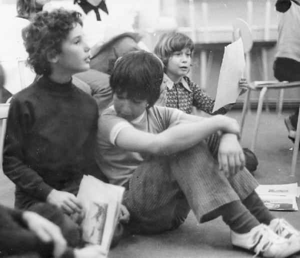 Figure 1.--The boys in a Canadian school show the popular fashions in 1973. Also note the long hair styles. Image courtesy of the MC collection. |