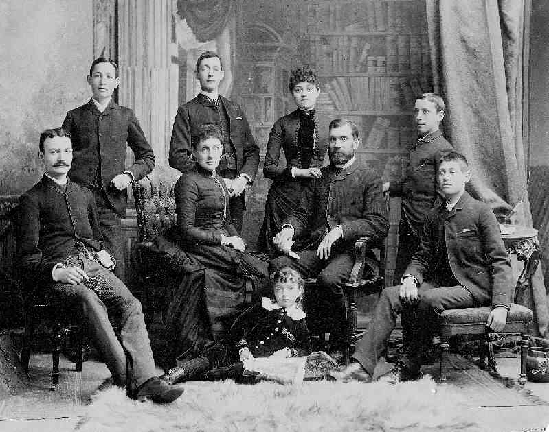 The individuals left to right are: Charles Edward Burch (seated, 1862-1923), Harry (1870-?), Edwin Walter (1868-1953), Eva Harriet (his twin, 1868-?), Frederick Ashton (1875-1950), Arthur Elvin (1872-1910); in the centre Harriet Thorp Burch (1846-1898) and Edward (1837-1911), and in front Ernest Clarence, (1881-1925).