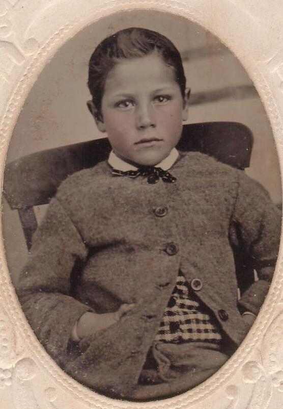 We notice Canadian boys weating cut-away jackets in the mid-19th century. We do not have many images Canadian images so we cannot yet develop much information about these suits in Canada. But as the cut-away javket suit was a popular style in both America and Britain we believe it must also have been common in Canada. These were worn both with matching and other pants. We notice boys wearing what look like home-made cut away jackets, we think they were commonly worn in the 1860s and 70s. We note the cut-awy jackets done in many different styles. We see them worn both with and without vests. They were also worn with various trouser types. We see boys wearing knee pants, bloomer knickers, and long pants. We do not yet have sufficent images to work out the conventions involved. A reader writes, "It looks to me that what you call call a cutaway-jacket here is really not cut away, but worn like a cut-away jacket." I think our reader is probably correct, although it is a little hard to tell just how the jacket may be constructed." It is, however, definitely worn like a cut-away showing that the fashion was still popular. We think that the jacket was intentionaally buttoned just for this reason.