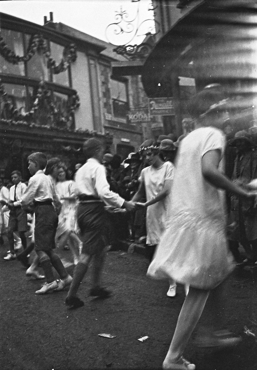 We note daning as part of town and village celebrations in the erly 20th cntury. we suspect this was a well-establihed tradition in the 19th century with much earlier roots. These dance traditions seems to have significantly declines since World War II, especially for boys. The uncreasingly popularity od sports here may be a factor. Before World War II we notice images of many of these village events throughout England. The children dressed up for the events. Boys commonly wear school clothes, the girls often wear white dresses. The younger boys were also sometimes done upmin white. The children participation was often organized through the schools. We have not yet found much imnformation about the dancing, but we have found quite a few examples in the photographic record. The children here are a good example (figure 1). They appear to May Poll dancers patricipating in the festival after they did the May Poll.
