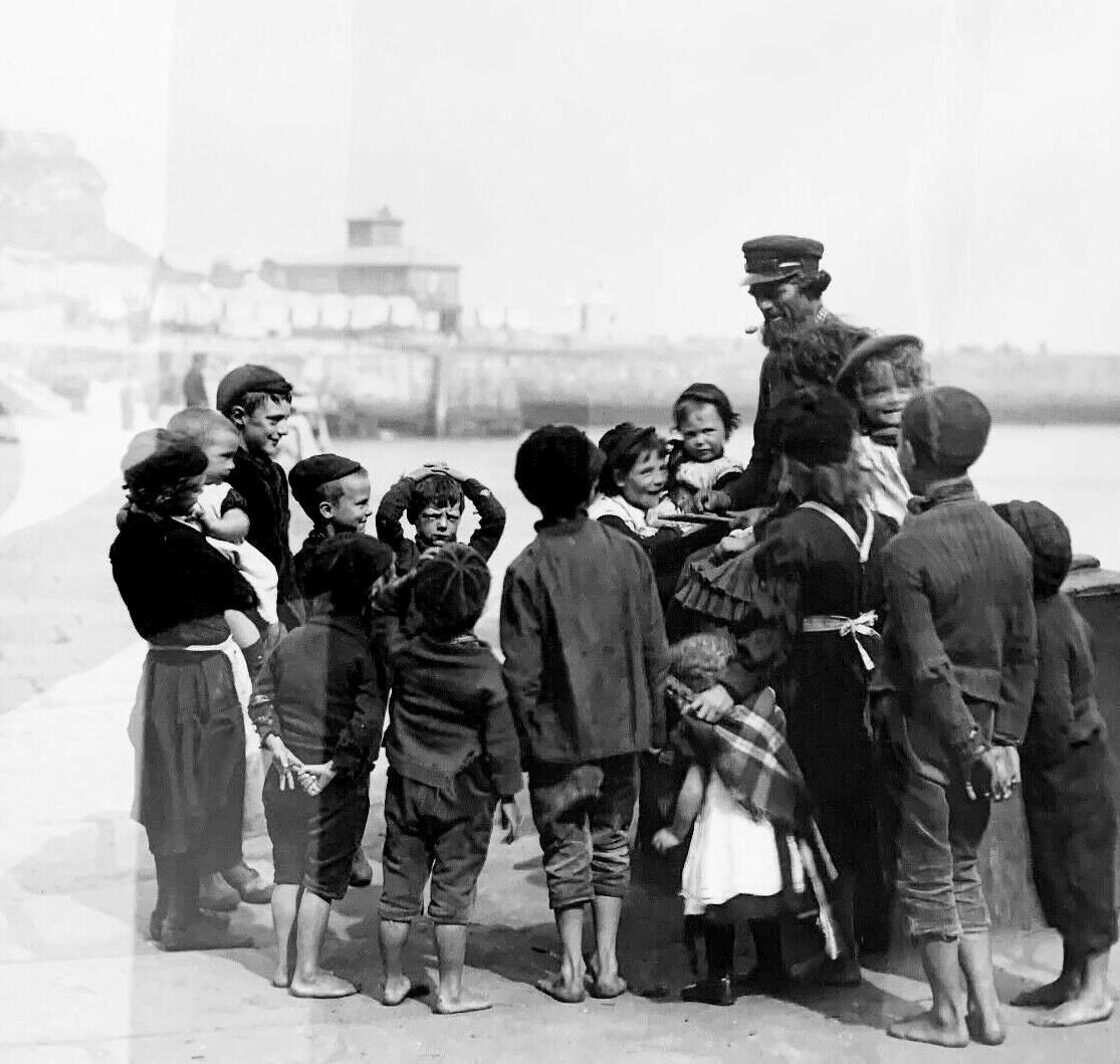 Social class was still a major factor in how children dressed. Clothing was much more expensive in relative terms before the 20th century and this continued into the early-20th century. Here we are not talking about actual monetary costs. There have been enormoudly expensive garments througout recorded history. What we are talking about is the percentage of income families had to devote to clothing. A variety of factors were at play bringing down the cost of clothing: 1) factory manufacture, 2) the industrial recolution, 3) rising wages and family wealth, 4) falling family sizes, 5) expanding education systems, 6) technological advances, 7) improved social welfare system, and the 8) increasing use of cotton. by the turn of the 20th century these factors had even reached how the working class lived and dressed. We still see barefoot English children at the turn-of-the 20th century, especially the boys. Leather shoes are the most expensive clothing item. And at the turn-of the century, leather shoes still dominated footwear. But this is the last decade that we still see large bnumbers of barefoot English children. England at the time was the wealtheist European country which is why we still see barefoot children in other European countries until after World War II.