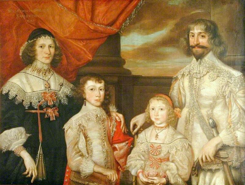This beautiful portit of Sir Francis Ottley (1600-49) and his family was painted by Petrus Troueil (active 1633-36). It was painted about a decade before the Civil War. We know nothing about the artist. He painted for only a short period. His name does not sound English, but all his works were English. He clearly is an accomplished artist. It is strange that he was active for such a short priod. And it has remained at the Ottley family home, Pitchford Hall, from the date it was painted (1636) until the contents of the house were dispersed (1992). The painting is of Ottley and hius wife with two of their three known children, Richard and Mary. Ottley married Lucy Edwards, daughter of Thomas Edwards of the College, Shrewsbury (1624). She was the widow of Thomas Pope, another Shrewsbury resident, and was some 8 years older than her husband. We see the lace and decorations and fabrics that the Cavilers were so famous for. Interestingly Mary is wearing a black dress, allbeit with elaborate lacy collar and wrist cuff decoration. Ottley was Governor of Shrewsbury and an important royalist commander during the English Civil War (1642-51). King Charles placed him in chgarge of the Royal Mint established in Shrewsbury during the War. Ottley served as the Royalist High Sheriff of the county and helped negotiate the surrender of Bridgnorth. After being captured and parolled, Ottley spent much of the rest of his life trying to free his estates from sequestration.