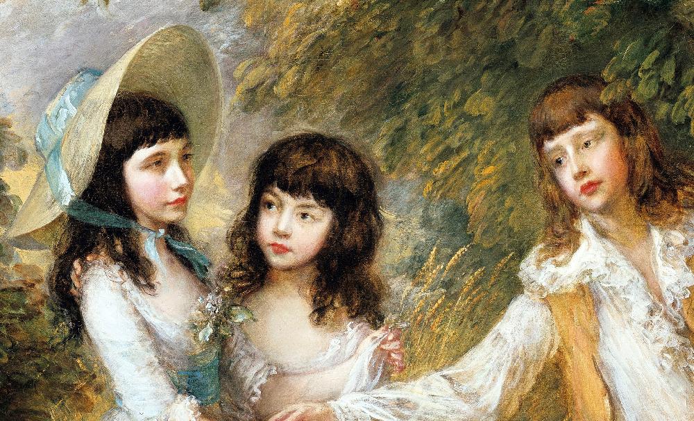 This was one of the last of the magnificent portaits done by famed English portraitist Thomas Gainsborough (1727-88). Charles Marsham (1744-1811) was the son of Robert Marsham, 2nd Baron Romney, and Priscilla, daughter and heiress of Charles Pym. He was educated at Eton College (1753-63) and entered Christ Church, Oxford (1763). He succeeded his father to the barony (1793). He inherited his grandfather's large and hugely profitabke sugar plantations, jointly known as 'Romney's', on the Caribbean island of St. Kitts. The property had been part of his father's marriage settlement to his mother (1742). Throughout the 18th century and into the 19th century it was operated with brutal slave labor. Caribbean sugar plantations were essenrially death camps. The French plabtaions in what is now Haiti were the wirse, but the British camos were akso extrodinarily brutal. Charles as known as Lord Romney between 1793 and 1801 and sat in the House of Commons from (1768-90), meaning during the American Revolution. He inherited his peerage after the death of his father (1793) and was created rge first Earl of Romney (1801). Marsham commissioned a life-size group portrait of his children (Amelia Charlotte, Frances, Harriot and Charles, (July 1787). Commisioning Gainsborough is just obe example of the family's wealth. The children are surrounded by an impressive late summer landscape, presumably part of the Earl's extensive gardens. Setting the portrai in tge garden was in part to create a sence of informality. The children, however, are pictured almost as they do not know that their siblings are present, even the two at the center embracing each other. Having four children sit still For an extended period woukd have been a challenge. So obviously he had them sit separtely (especially fir the faces) and merged them into the portait. Notice that their eyes do not meet. One art expert comments that as a result, 'the composition is lacking in convincing inner rapport'. The children are depicted collecting hazelnuts. The girls and younger boys wear long white dressess in the Empire style. The oldest girl has a large straw hat with blue ribbons.
