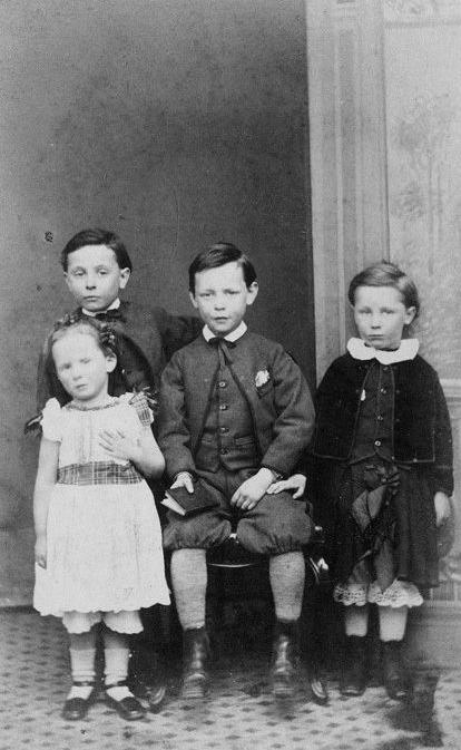 This CDV portrait shows shows four unidentified children, three boys and a girl. They look to be about 3-10/11 years of age, about 2 years between each child. The youngest child is the girl. She looks to be about 3 years old and wears a white dress open collar with puff sleeves, plaid leading ribbon, and waist band, and plain pantalettes. she wears socks and strap shoes. The youngesg boy looks to be about 5 years old wears a rather complicated dress. As it is so dark it is hard to make out detail, but there seems to be a ruffled collar along with a velvet jacket and vest (waistcoat). There appear to be decorative ribbons on the skirt of the dress. And like his sister he has pantalettes, but for some reason fancier ones. He has white long stockings and high-top shoes. The two older boys look to be abou 7-10 years of age, although the older boy could be 11 years old. Tbe boys are wearing idential cut-away jackets and vests. The suits are both probably done wth bloomer knickers, although we can only see the older boy's pants. Note the identical small white collars and ribbon ties. He has light-colored long stokings and high-top shoes. The portrait is undated, but the studio set and pointed corners of the CDV sugget the 1860s, probably the late-60s. The stuio was J. Elliott in Bishop Wearmouth, a part of Sundrland in northeast England.