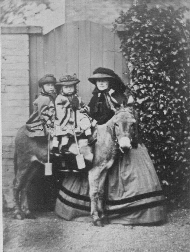 This Cattley family CDV studio portrait is we think an efort to depict an English beach scene, but it could have been taken outside. Notice the donkey and wooden spades. There is no studio information. While it is not dated, it looks like the 1860s to us. Mother has an impressive hoop skirt. We are not sure about the children. The one with the plain hat may be a boy. They look ti be about 2-4 years old. This is apparently the family of Henry Richard Cattley (born st Petersburg Russia 1818) family. The mother may be Mary Ann Wilks (born Russia 1818 - died 1895). We are unsure about the Russian connection, but the image could not be more British. A reader writes, "In 1818 there was a large contingency of British, French, German and other Western Europeans living in St. Petersburg due to Russian success in defeating Napoleon. I suspect these children were scion of diplomats or merchants living in the foreign quarters of St. Petersburg. That is a total guess based upon my history reading."