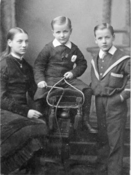 The yonger boy wears a very basic sailor suit with little detailing and bloomer knickers. I am not sure what he is holding, but it may be a whip and collar to play horsey. The older boy wears a much more elaborate long pants sailor suit. Notice that the boys do not have dickies, but rater shirt or vest-likr garments. There big sister wears a dark, but rather elaborate long dress. It is so dark that it is difficult to see the details. We note elaborate flounces and she has a locket. The portrait is notable for the care with the children's hair. Notice the razor parts. It is a also a good example as to how girls parted their hair in the middle and boys on the side. Although perfectly parted, the girl's hair is very plainly done. The studio was Vincent Hatch in Hudderfield. They advertised the print as a 'Chromotype'. I think this meant it was a sepia print which wa seen as a more natural color. Huddersfield is a large market town in the metropolitan borough of Kirklees, West Yorkshire.