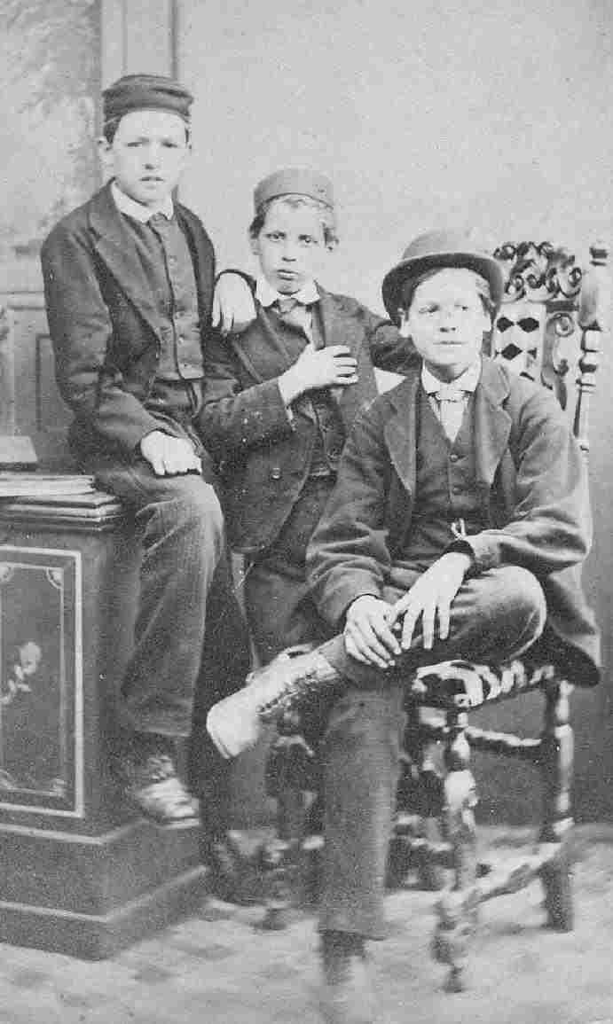 We note some interesting aspects to the clothes the boys are wearing. We notice similarities and differences with how the boys are dressed. Here there are different headwear and jacket styles. Both Petley and Morris wear the style of smoking cap we constantly see in these images. William Robinson is here wearing a bowler hat. Both Petley and Morris wear a style of jacket that is not seen in many of these photos; that of one that buttoned low in the way that most jackets do today. Morris has particularly large lapels to his jacket. William is wearing the type of jacket we would expect from the other images of him. All boys are wearing waistcoats. Both Morris and Robinson's waistcoats are fairly normal, but Petley's goes right up to the neck. Robinson is also wearing a watchchain. The collar of Petley's shirt is worn over the top of his waistcoat and we do not know if he wears a tie. Morris's shirt appears to have an unstiffened collar (it is unlikely he would be wearing an unironed shirt for a formal portrait). William's tie has a very wide knot in it. All the boys seem to be wearing matching trousers, but there is a small possibility that Petley was wearing corduroy trousers as there seem to be a series of thin closely-spaced stripes visible around the right knee. It is not possible to ascertain what footwear Petley or Morris wore for this portrait, but we can see William is wearing boots and he appears to be wearing some light-coloured thickly-ribbed socks or stockings.