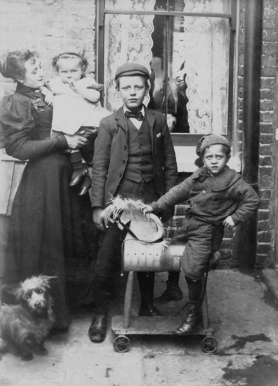 This cabinet card portait with a dark green mount appears to be the work of an intinerant photographer which perhaps is why there is no studio information on the mount. It appears to be taken on the stoop of an unidentified family's home. It is undated but the arge baloon sleeves of the mother helps to date it to about 1895. It is interesting to see the family not in the studio, but with their home in the background. We would say that this was a working-class family. The pooch and hobby horse suggest that they are living in comfortable circumsances. We are guessing the little boy insisted on having his precicious hobby horse in the portrait. The father is not in the portrait, probably because he was at work when the portrait was taken. The boys look to be about 5-11 yers old. The older boy wears school cap and knee pant suit. He would have still been in school. We are a little surprised that he is not wearing an Eton collar. His younger brother wears a kind of tassled stocking cap and blouse-jacket with a large collar that has striping.