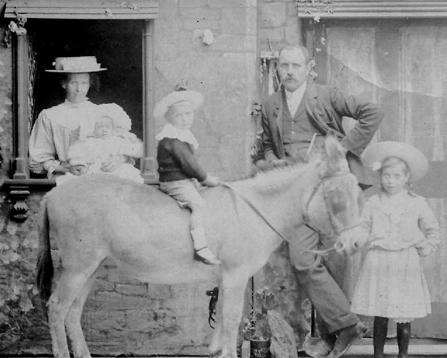 This looks to us like a prosperous middle-class family on vacation. Unfortunately we have no information on the family other than it has a postcard back showing that it was English and taken some time in the eary-20th centurty. It looks like the 1900s to us, but the early-1910s is possible. We think the the family is on vacation, because of the donkey and cottage. Donkeys were often found at beach vacation sites, but may have been available at other resort areas. We are not sure if the donkey her is a real or studio stuffed donkey prop. The cottage is a studio backdrop looking like what a family might rent for a vacation stay. We suspect that they had a much grander home. The family had three children. The parents look rather old for such young children. We thought that they might be grandparents, but the baby sems very young to be entrusted to the grandparents for a vacation. The children look to be about 6 months to 5 years old. The baby is done up in a great infant outfit complete with a huge bonnet. The boy wears a jacket with a Fauntleroy collar, short pants, white three-quarter socks, and strap shoes. His tam has a pom, rather like a French navy cap. Their older sister wears a classic broad-brimmed hat with a light-colored summer dress, pantalettes, and black long stockings. She has a hair bow and ringlet curls.