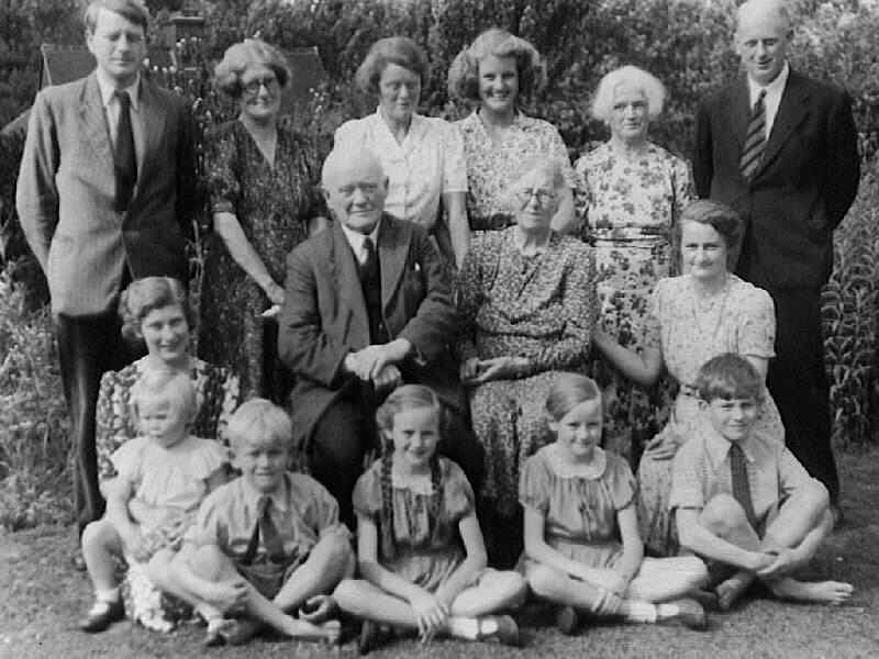 This family photograph was taken in Buckhurst Hill, a suburban of Epping Forest district of Essex. Edward Shillito (1872-1948), was a Free Church Pastor. He wrote also many poems. He married Annie Elizabeth Brown (1901). The photo was taken during a family gathering that took place in summer 1945 afer VE Day. During the War a part of the family was evacuated. Now the grandparents could meet their children, children-in-law and grandchildren. Some of the grandchildren were born in Uganda, where the son Jim taught at a missionary school in Nyakasura, near Kampala. This proably explains why the two boys are barefoot.