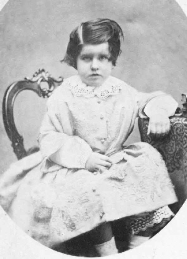 Here we see Harold Herbert Capper in London when he was 4 years old. Unlike most of the CDVs in the album, this one is undated. We believe the portrait was proably taken during the mid-1860s. He wears a heavily embroidered light colored dress with a pin-on lace collar and pamtalettes. Notice the puff sleeves comong out of wide sleeves. His hair style is especially striking for a right razor part. English boys normally had left parts. This was somewaht less common for younger boys before breaching. No further information available, it is possible that he is the younger brother of Mary Ella Capper the original owner of the album. There is a later CDV of him which was taken in Stuttgart, Germany which may explain why he does not appear in the 1881 census.