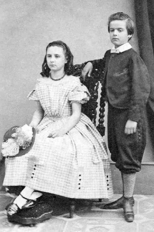 Bertha and Wilfred were the eldest children of John and Anne Hardcastle. Bertha was born in 1852 and Wilfred in 1854. Bertha wears a checked dress with an open collar and puff sleeves. Wilfred wears what looks like a dark flannel suit. He has a small Eton collar and very small bow. The knickers have seem detailing with what looks like buttons. Notice his hair cut, coming down partially over his ears. He has a left part. At the time of the 1881 census they were both unmarried and living at the family home in St Johns Wood, London. Wilfred's occupation is given as Architect.