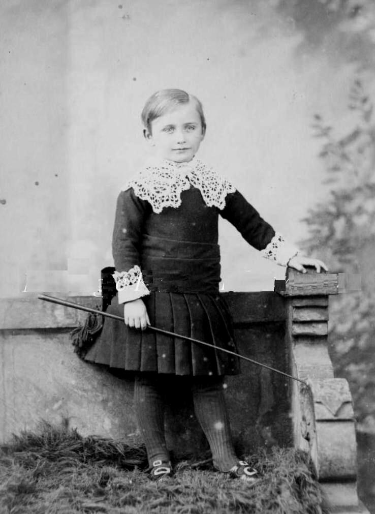 Age 5 is the last year that we see relly large numbers of boys earing dresses. A major factor here was school. Boys were normally breeched before beginning school which commonly occurred at about age 6 years. This was less definative in the 19th century when the public school system was not fully established. England lagged behind America and Germany in establishing a public education system, but by the end of the 19th century England had a fully established public system, at least for the primary years. The number of 5 year olds still wearing dresses declined notably in the late-19th century, especially the 1890s. Social class was a major factor in 5-year olds. Most working-class children were breeched by thus age, many a year or two earlier. This was less true for boys from families in more comfortable circumtances. All of this of course varied chrononogically and from family to family. But still we see quite a few boys still wearing dresses at age 5 years. An example of a rich boy is George Lambton in the 1860s. Another good exaple is a whole family -- Chester family. The family is not identified or the age specified, but as there are three children, it is very likely that the older boy is at least 5 years old. Another good example is this unidentified London boy in 1902 (figure 1). There is no age information on the card, but the boy looks to be about 5 years old. He wears a plain dress with a pleated skirt. Boy dresses especially by the early-20th century tended to be plain. The major decoration is a lace collar and matching sleeave ciff. Thee is a wide waistband along with a back bow and sash.