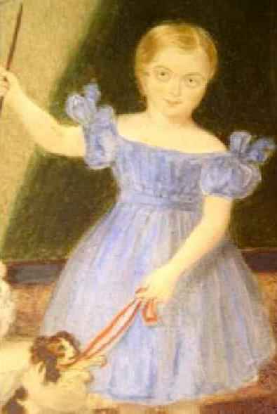 The children are also unidentified. They clearly came from an affluent land-holding family. Presumably the portrait was taken in the manor house outlooking the family estate. We believe the older children are a boy and a girl. There are several reasons for this assessment. Of course there is no way to be definitive about such matters. First there is simple mathematics. A family is more likely to have a bow and a girl than two children of the same gender. Perhaps most telling is the dominant pose of the child. Girls were less likely to be posed like that. Also notice the riding whip, this was a very common prop for boys. The boys short hair and off center paet are another factor. The blue color of the dress may be another factor, but definitive color conventions were not yet widely accepted. The child in the yellow dress is more likely to be a girl. Note that while the children where the same dresses that their hair is styled differently. If they were the same gender, there hair woyld be more likely to be styled similarly. The longer hair and curls with a center part suggests a girl to us. Also note the girl is holding a ribbon, this is a very strong indicator that the child is a girl. The baby wears a bonet which was common for infants in the eatly 19th century. A reader writes, "This page is quite interesting. nteresting. The images are quite wonderful. I agree with you that the child in blue is a boy although at this time pink was more of a boy's color. I think the gender of the child in yellow is less certain."