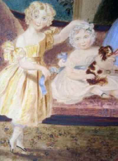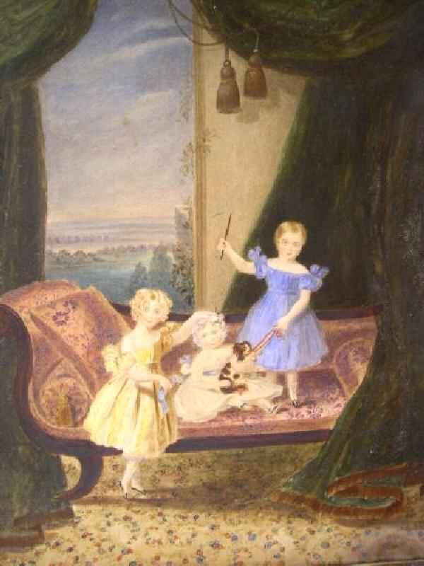 The water color shown here is unidentified. We know nothing about it. Our assessment, however, is that it was painted in England during the 1830s. It was not paintained by a master artist, it is however a charming image and the dresses and hair styles are painted in some detail. We believe the child in the blue dress is a boy, although there is no way to be certain about this.