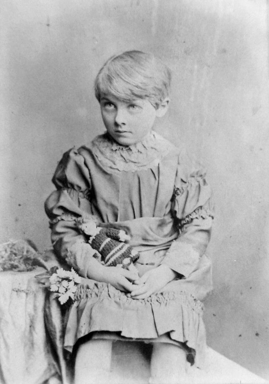 This cabinet card portrait shows an unidentified English child who looks to be about 7-8 years old. As with younger children in general, a facial identification of gender is difficult. The child has full hair, but cut above the ears. The outfit is a pleated dress and wide wait sash. The photographic dealer identified the child as a boy. We are not sure why, but suspect it was the short hair. Ot it could be the child's side hair part. That often indicates a boy. At the time it was not uncommon for girls to have short hair. There are two elements that suggests strongly that the child is a girl. Flowers were a common prop for girls as well as the girl doll. We are not sure about the date, but would guess the 1890s. The studio was Robert Faulkner in London.