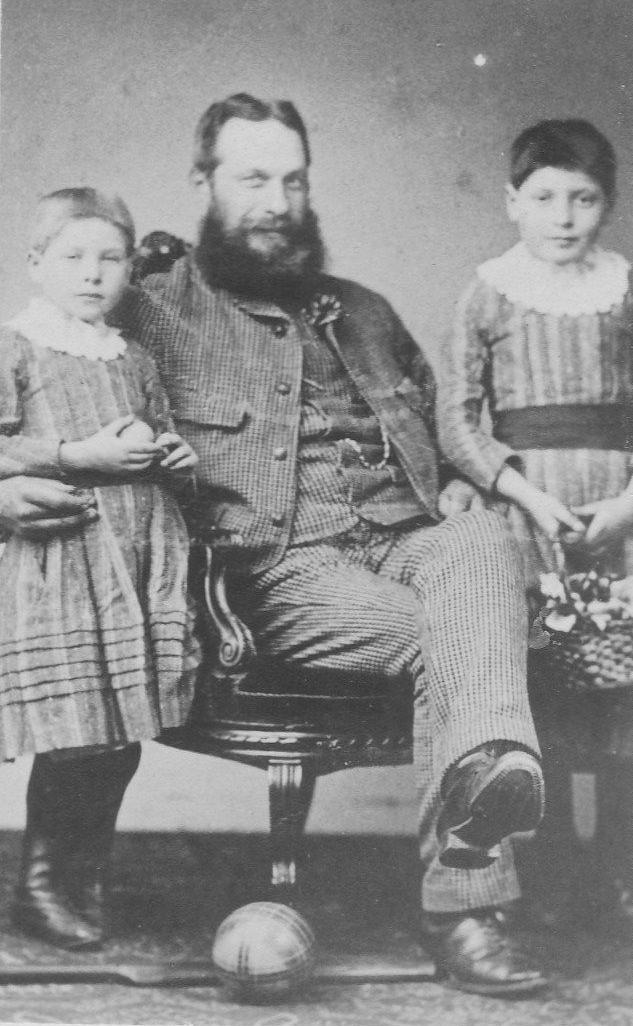 This English CDV shows an unidentified family--a very proud baming and beared father with his two children. At first glance it looks like two daughters. They look to be azbout 6-10 years old. Both children are wearing identical patterned dresses with lace collats and waist sash. They are long-sleeved plain dresses witn what looks like embriodered bnds on the lower skirt. The faces and short hair look rather boyish, but at this age faces can be deciving. And girls also had shirt hair, although it usually covered or at least touched on part of the ears. As the family is not identified, all we have to go is the image. We think that the older child must be a girl because of the age and the flower basket. The younger child may also be a girl, but we are less certain here. The child looks very boyish. And rather than a flower basket there is a ball. Now while a girl could be pictired with a ball, it was more common for boys. And in addition there is a larger ball at their feet. The portrait is indated, but looks like the 1870s to us. So many balls in a portrait of girls is rather unusual. There is no studio information on the mount.