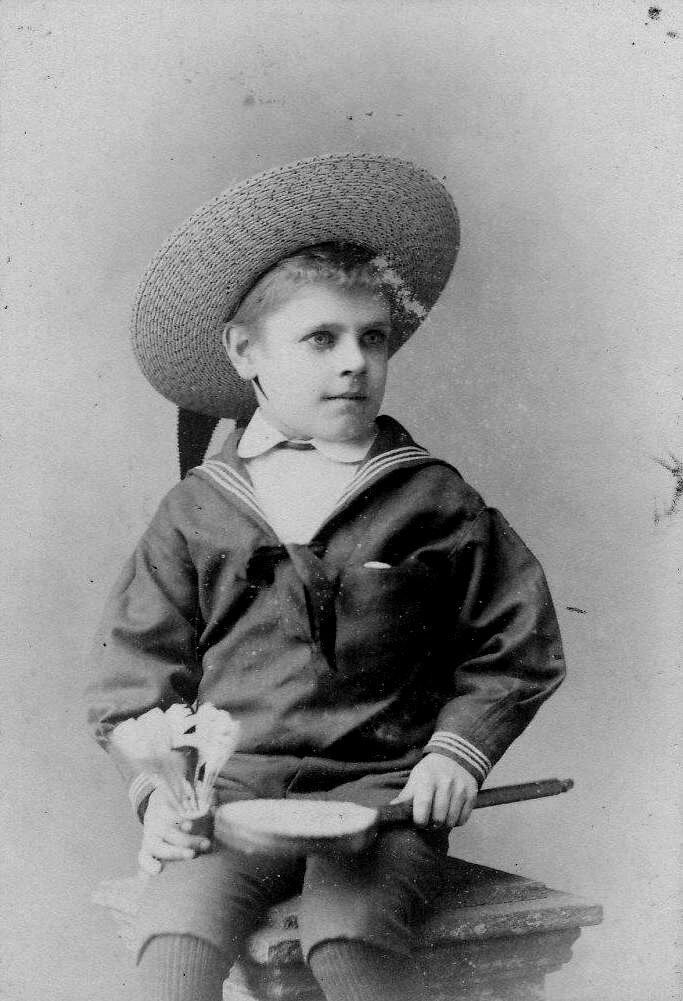 Many if not most sailor hats had streamers. This was of course because early sailor uniform hats had streamers. Most studio portraits were frontal shots with the boy facing the camera. From the front, however, we do not get see the streamers as most hung off the brim at the back, extensions of the silk ribbon hat bands. Thus the photographic records does not give aood idea of how common streamers were or details about them. The photograph on the previous page is a good example, athough sailor hats with upturned strongly brims often did not have long streamers. Streamers were most common on other sailor headwear and for some reason Scottish headwear. The streamers could be both single and double. The double streamers seem to hve been more common with actual sailor hats as the mariners could reinforce the chin straps to tie the hat on in windy weather. The