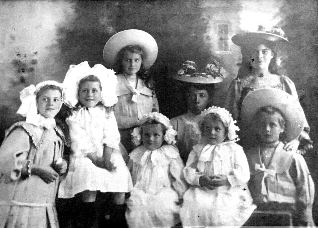This English cabinet card portrait in fortunantely comes with nominfoirmation. The porttait is undated, but the mount suggests the 1900s decade. Theearly-1910s is possible. Given the similarity of dress, this is probably a family portrit. The age range vis faesible. They look to be about 2-15 years old. There is woman in the middle surrounded by girls, three of which are wearing bonnets. The child at the lower right may be a boy, but we are not sure. Areader writes, "At first glance, I thought the child in upper left in the sailor suit was a girl with long hair, but the more I look at her/ him the more uncertain I become. To me it is very possible that the child is a boy who has yet to have his hair cut. The girl in the far left bottom row is definitely a girl and she is wearing a ruffled sailor like collar and a bonnet like head covering as well as all the younger children except the two wearing sailor straw hats. I suspect those two are boys and are strategically placed in the picture. The image is not clear enough for me to be 100% certain but it is my guess." It is impossible to know for sure even if it was a nice clear image. If it was American I would be sure the child in the back was a girl because the long hair is not curled. We have some information on English hair styles. While not so universal, curling was very common in Britain. The French referred to ringlets as an English style. But given her age and looks, we think a girl. The child at the right is more of a question to us. We suspect a boy, in part because of what we can see of his hair. (There is no way to tell because we can not see if the children are wearing skirts or pants--the primary way to tell if the children are not named.) In addition, if this is a family group, the odds suggest that there should be a boy somewhere is the group. The sailor blouse is identical to that of the child in the back with an identical broad-brimmed hat.