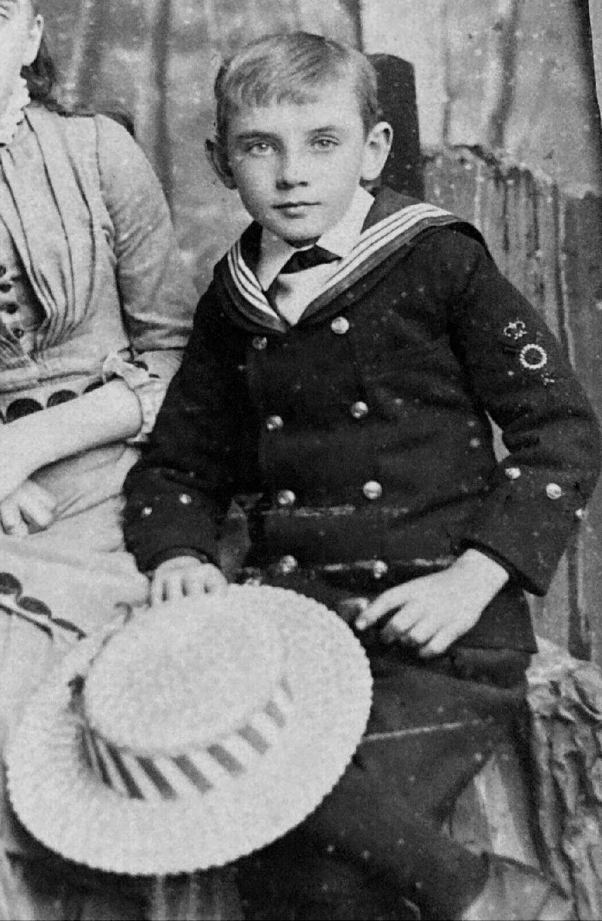 The clothing English boys wore with boaters is a little complicated. At first we are talking about older boys at public (elite boarding) schools. Because he basically fragile boaters were impractical as boys wear, we only see hem being worn when he boys were dressed up. And mostly by well-to-do or at least families n comfortable circumstance. Younger boys might wear wide-brimmed hats, but school age boys might wear boaters. This include a range of outfits like cut-away jackets as the boys on he previous page are sporting. We also see boaters being worn with Fauntleroy and sailor suits. Sailor suits were often worn with sailor caps of some kind, bu boaters were also a popular choice at least for boys up to about age 10 years. This began to decline for boys at about age 8 years or so because so many of the well-to-do children went to private preparatory schools (primary-level boarding schools). This usually began at abuot age 8 years, alhough some boys might begin a litle later. Thus you do not tend to see see older English primary children wearing sailor suits, especially with boaters. In contrast, boys on the Continent mght wear sailr sus into heir early teens--alhogh no usuually wih boaters. And these schools had school uniforms which usually involved the iconic peaked school caps. When they went on o public schools, they might wear boaters, such as Harrow. But even at public schools, the boater was worn mostly by the older boys, usually during the summer.
