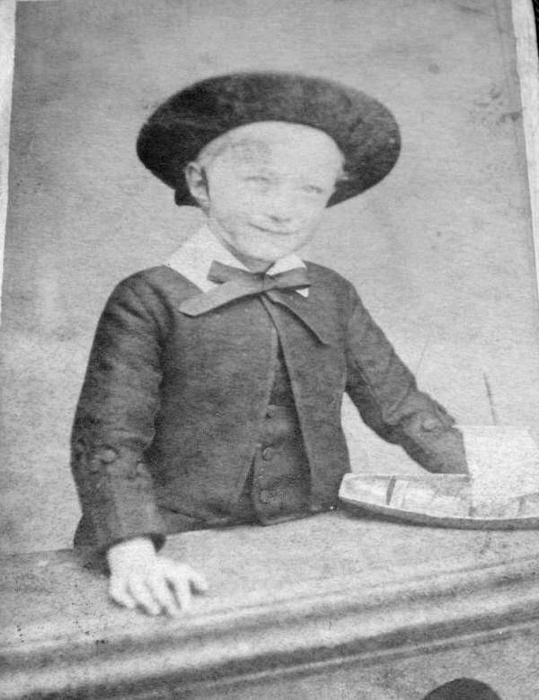 Rounded crown hats had moderate brims and of ourse rounded crowns. They were also referred to as parson's hats. This as an enormously popular style in America, especially in rural areas throughout the 19th century. We are less sure how common these hats were in England because our English 19th century is much more limited. We have found some examples so we know they were worn by boys to some extent. As in America it was a 19th century style. We are less sure about girls, but belive that girls did wear them as well. Some had streamers. We are less sure about the length od the streamers. We do not know about chin straps. The examples we have found so far are dark colors, but we do not know about the actual shades, we suspdct they were mostly brown and black. We are not yet able to develop afe comventions, but suspect they were worn by boys to about 8-9 years of age.