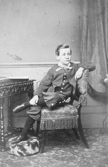 The basic garments of a suit are jacket , vest, and pants. The type of suit is primarily determined by the jacket styles. In the 1870s we see cut-away jacket suits, sack suits with lapels, anf frock suit ith longer jackets. Cut-way jackets mostly came with vests. We see boys up to about 10-years of age wearing them and were even more common for slightly younger boys. We note both plain ones and and heavily decorated ones. They were still quite common atthe beginningb ifthe decade, but less so by the end of the deade. As the cit-away jacket was a style for younger boys, they often, but not always were done with shotrend-length pants. We note noth knickers and kneepants. The knickers seem the most common. Lapels and buttoning arrangements could be quite varied. Vests were very common. Most boys wore long pants with suits. Younger boys might wear suits with knee pants or knickers, but most boys by about 10-years of age were wearing long pants, many even younger. Some of the knickers had full (baggy) cuts. The knee pants were often done with wide legs. The pants were often decorated with stripes and other detailing, matching the decoration on the jackets.
