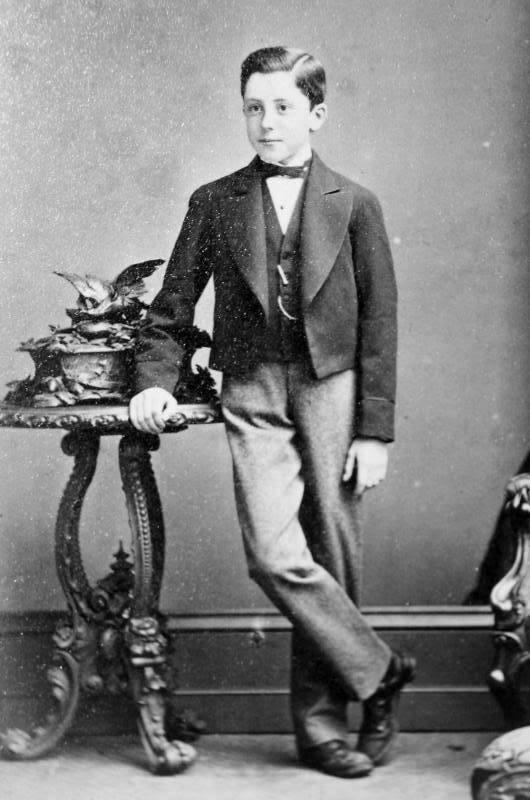 We see some boys with short lapel jackets. We see different styles. Some might have been called Eton jackets, actual Eton jackets might have loels--unlike the juveiile Eton jackets that became so popular in America. And we note them being worn without Eton collars. We notice some done as mock double-breasted jackets. Based on the photographic record, these short jackets were not one of the more common suit jacket styles. The short cut-away jacket was a much more common style. The length of these jackets and the size of the lapels were among the variations in these jackets. Cut-away jackets were also short, but generally did not have lapels. We think these short jackets were primarily a school style, perhaps English readers can confirm this. This jacket may be better described as a school unifirm style, but we can not yet conform that this was the excludive usage. Eton jackets may have been the precursor for these short jackets, but it is hard to describe them as Eton jackets when worn without the destinctive Eton collars. There were a number of public (private boarding) schools in Britain and many seem to have wanted a somewhat varied uniform. The examples we have found seem to date to the 1860s-70s, but our archive is limited and this is just a preliminary assessment. Notice that the jacket and trousers do not match in the example here (figure 1). We note suits that generally matched in the 60s, but schools may have lagged this basic fashion shift.