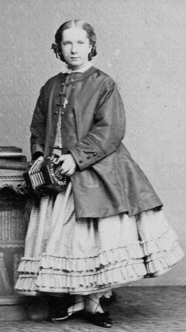 I think Emily Haigh may possibly be a cousin, the photo is not dated but I would date it at around 1870--notice she is holding a concertina. The photographers name (Moira and haigh) is probably just a coincidence, George Haigh had his photo taken at this studio in 1867. Emily seems more of a young woman than a girl. Notice her dresses fall all the way to her ankles. She is wearing panatelettes with them. She looks to be in her early 20s. The dress is nothing like the boys and Gwedoline wore. The dress is more like tghe ones that boys' mother wore. In addition to the dress she wears a dark jacket or cape-like garment over her dress--very different than the short jackets the boys wore. I am not sure about the colors of these garments. Notice how differently Emily's hair is from the way the boys wore their hair. It is done up and parted in the center.