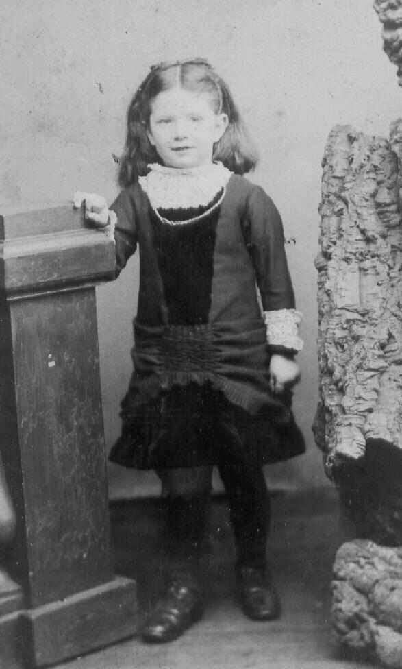 Percy here looks about 5 years old. Perhaps he is not quite 5, but we suspect he is almost 5 or has just turned 5 years old. The portrait is dated 1880, but as we mentioned, we are unsure what that means. W have genweally presented the portraits of Percy as 1880s images, but this and some of the others it seem to us have a 1870s look. Again Percy has a dressed with elaborate lace work atound the collar and worked up as a kind of front dress decoration. The dress in done with two materials. There is a dark overay, but I am unsure about the color. The overlay has a lot of fancy work, unusual in boy dress, especially a boy by 5 years of age. Underneath it looks like black velvet. The Lace is repeaed at the sleeve cuffs. He wears the dress with black long stockings. Also notice the necklace. Percy's hair has been allowed to grow longer. He still has the girlish center part. There are no props with this portrait. I must sy that if I was viewing ths portrait without any identification, I probanly would have concluded that the child was a girl.