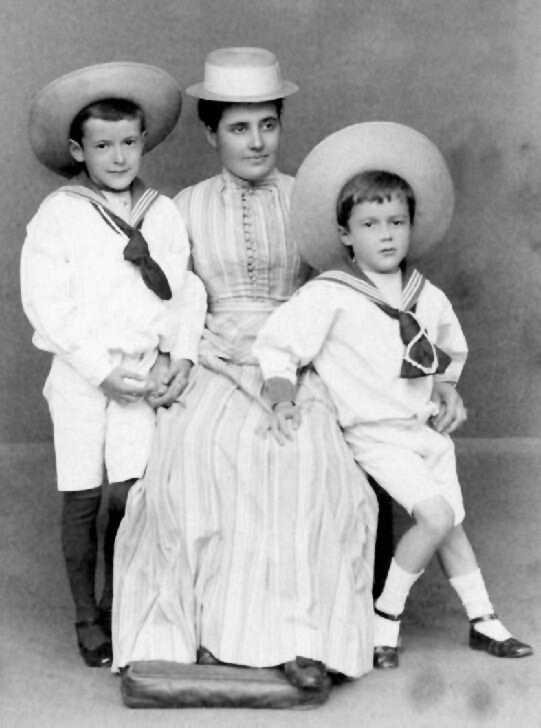 The wide-brimmed sailor hat was a very poular boys' style. It was widely worn with sailor suits as well as otherstles like Fauntleroy suits. The older boy wars a slightly smaller wide-brimmed sailor hat. Note how the younger boy with the larger hat wers his hat well back on his head. I am not sure this is related to a fashion statement, but rather becaus it would have been difficult to photograph the three together if the hats had been properly seated on their heads. Another possibility is that mother wanted their hair to show. Then again it may have been the photographer that posed them like this.