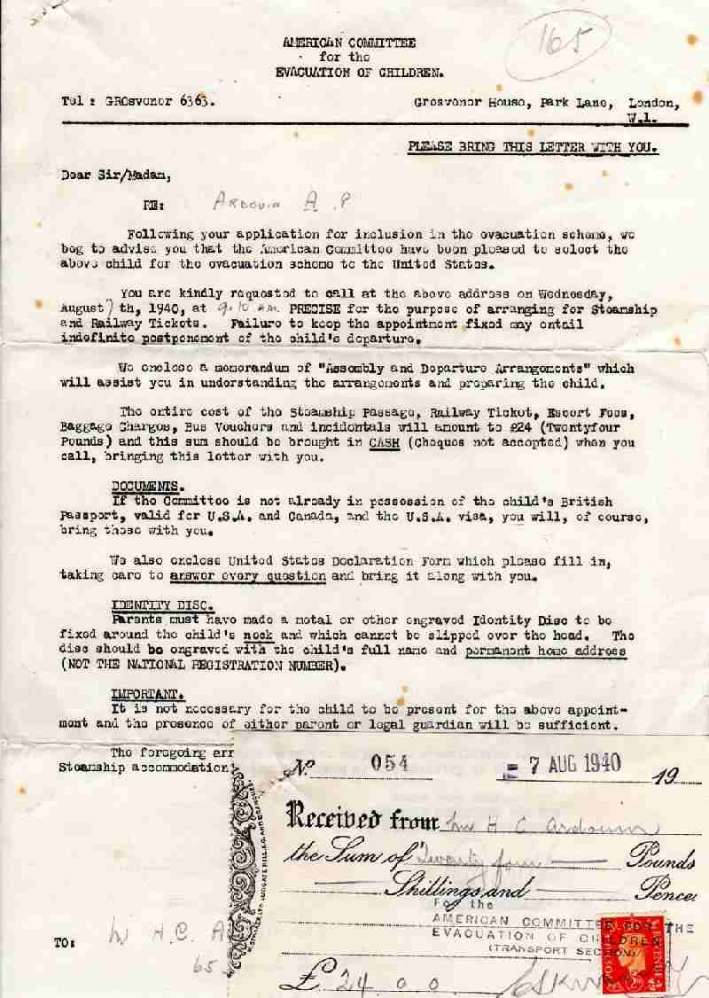 I am not entirely sure how the American Committee made their selections. Attached is our letter of acceptance from the American Committee and the receipt for my passage and visas etc. You see this was dated Auguest 5, 1940. £25 was quite a lot of money in those days and our parents had two boys to pat for. This lef to criticisms in the press that the better off were being preferences in the overseas evacuations.