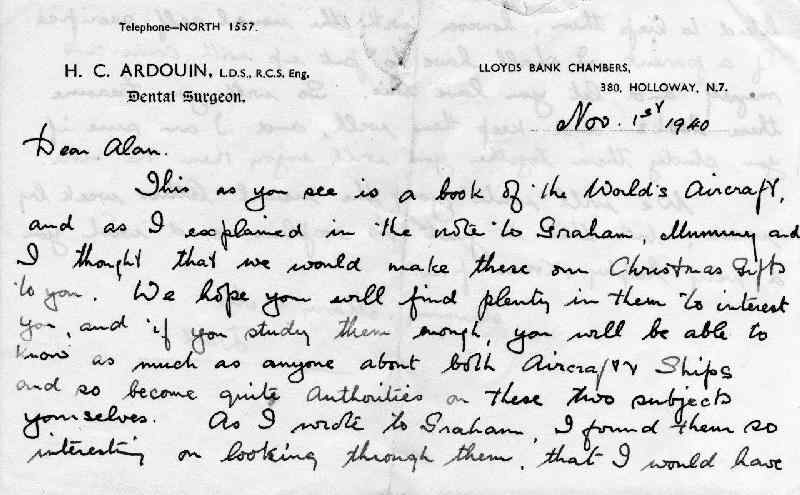 Sadly neither Graham or I saved our parent's letters. I do have one letter from my parents , which turned up several years later. When my foster mother died, the daughters had a clear out of the house, and found a book, Janes Fighting Aircraft 1939', which Dad had sent me as a Christmas present. They sent it to me. Inside the book was a covering letter dated November 1, 1940. By that time the Luftwaffe had been dealt a severe set back and had been forced to bomb only by night. Britain had stopped the NAZIs in their tracks, but America was not yet in the War and what laid ahead with the Germans controoling much of Europe was uncear. They did send gifts from time to time (birthdays and Christmas), but some were lost when the mail ships were sunk.