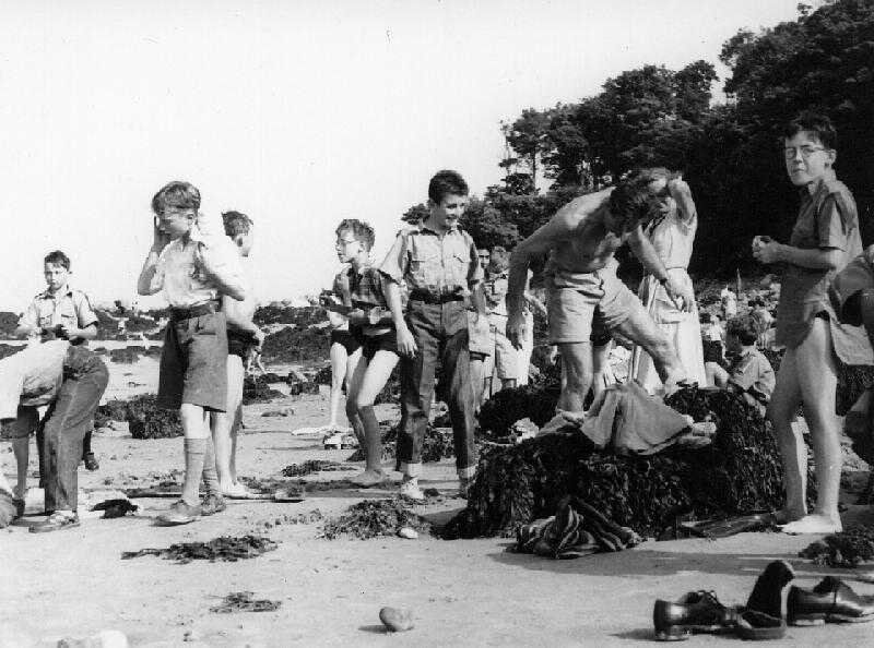 I also recall what I wore out of schoo and have a number of school photographs. They show what a middle class British boy wore then. I think Jeans may have arrived in Britain earlier than most people think. I have a photograph of myself wearing a "T"-shirt and jeans in 1950 when I was 9 years old. The photograph here shows my Scout troop at the beach about 1953 when I was 12 years old. Those are English Boy Scouts. And if you look to the left there is already another Scout wearing jeans. Mine are traditional Levis, his the trimmer English style which I think looked better. Both were available then.