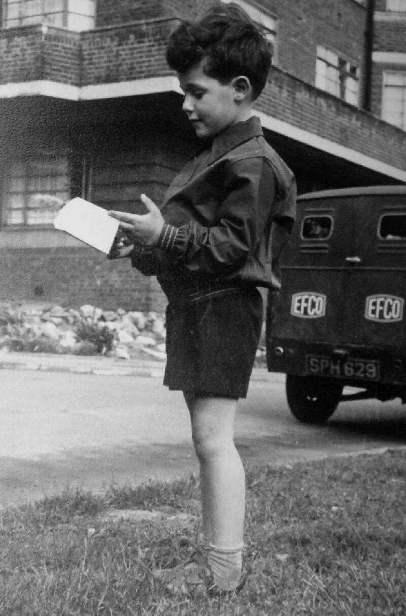 David wears different outfits in family snapshots. We see him wearing a kind of junior including sailor suit. These junior sailor suits were commonly done as button-on outfirs in the 1940s. David has elazticized shorts for his sailor suits. We also see a snapshot of David all done up with a bow tie and vest for his 6th birthday. We also see him wearing what looks like a jacket with sailor stripes at the sleeve cuff (figure 1). He wears different kinds of short pants. He usually wore sandals with ankle socks. Dressed up for his birthday he wears slip on shoes. A reader writes, "On his 6th birthday he is seen wearing a bowtie. This was not common in England then. However I did think bow ties looked cool and wore one for school. This would be about 1955. It lasted about a month! It is possible that the family were academics and father wore a bow tie and his son likewise or the type of tie worn when there was a special occasion. Some of David's clothes are similar to ones I wore. I remember wearing a similiar jackets with similar design on the elasticated cuffs and the summer footwear- sandals."