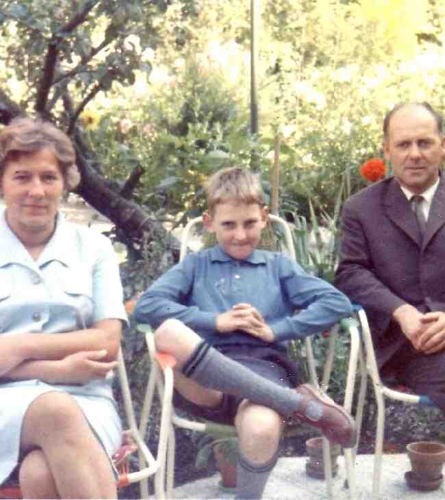 The father was a real serious photographer. He was insistent on posing the photos properly which is why I got bored. They took ages to set up. Most of the photos I have were taken in their back garden - I could hear my German mates playing football which is why in all of them I am ready to take off and why his mum had to grab me for the photo with her and her son as at that point I was ready to take off. For the one on this page he insisted we put our arms round each other's shoulders - you can see how unnatural this is as I've got one foot almost off the ground and am clenching my fist in frustration.