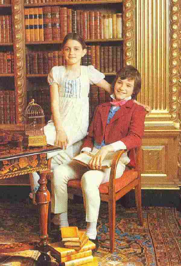 ![]() Figure 1.--This scene at Sudbury Hall is staged in the library to shown a Regency scene set about the 1810s with period costuming. |