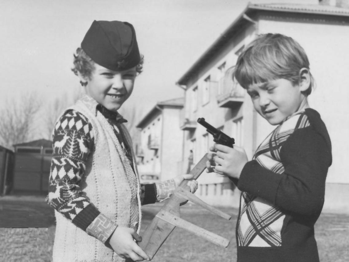 We have some limited information on Yougoslav toys. Time Magazine featured a 1935 article in which 11-year old King Peter bragged about Yugoslav toys, saying they were mostly electric. Actully most were hand crafted. [Yugoslavia:"] Slovenia bordering Austria was the most culturally Germaized area of Yugoslavia, having been part of the Austro-Hungarian Empire. There was a tradition of handicrafts. Perhaps the best known toy industry was Mehnotehnika in Slovenia. Mehnotehnika produced erector sets and high-qualty metal toy cars. Mehnotehnika from the Slovenian Izola founded (1952) was once manufacturing very inventive toys. A source claims that these toys were a symbol of growing up for a generation of Yugoslav chuidren. Toys from Izola were labeled with 'Made in Yugoslavia' and alsoexported to Australia, Brasil, and Canada among other countries. Much of what we notice from Yugoslavia was knockoffs of popular Western boys toys and a pletora of dolls. Barbie seemns absent, perhsps because of the very un-Marxist focus on fashions. We see a lot of toy cars which is interesting because very few Yugoslavs could afford to own one, although Yugoskave industry cme out with the Yugo, arguably the worst car ever made. Here we have two Yugoslav children, we think a boy and girl, with toys guns about 1960 (figure 1). The girl wears a Yugoslav Army hat. Note one is ahand made wooden gun.