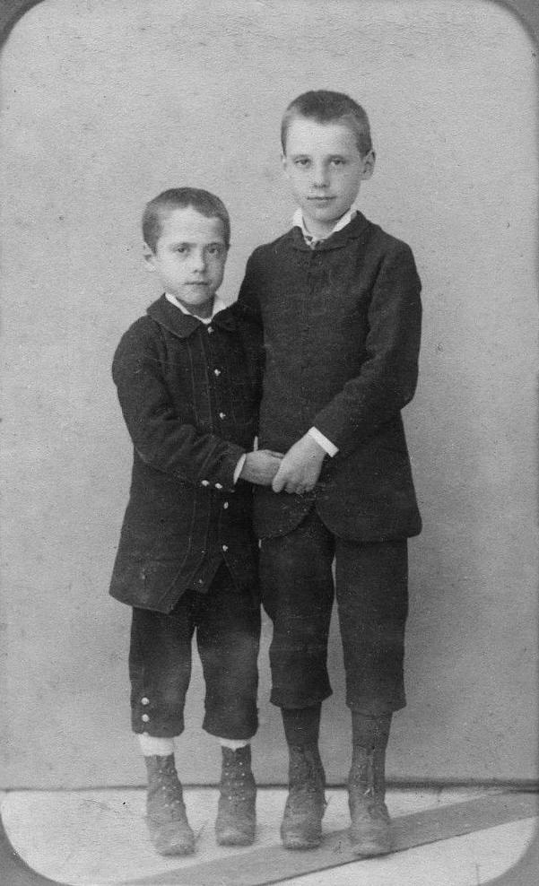 We notice collar buttoning suits in the 19th century. They tended to be plain jackets with relatively limited detailing. There werec variety of difference such a collar styling, buttons, pockets, and length of the jacket. This was a very common style for boys, one of the most common. We think social-class factors were involved. These jackets seem especually common with working-class as well as other moderate income boys. We are still working on the chronology. We are not sure about the early-19th century. but we see examples in the mid- and late-19th century. A good example is velvet suits worn by the Parisian Caplain brothers in the 1860s. Collar buttoning suits continued to be common in the 1880s. we note a portrait of two unidentified Tours boys in 1886 (figure 1). The younger boy wears a collar buttoning suit. His older brother looks to be wearing collar-buttoning jacket as well, but he actually wears a jacket with lapels that are so small it looks like a collar buttoning jacket. We continue to see these collar-buttoning suits into the early-20th century. They were commonly done with knee pants. Here the length varied over time.