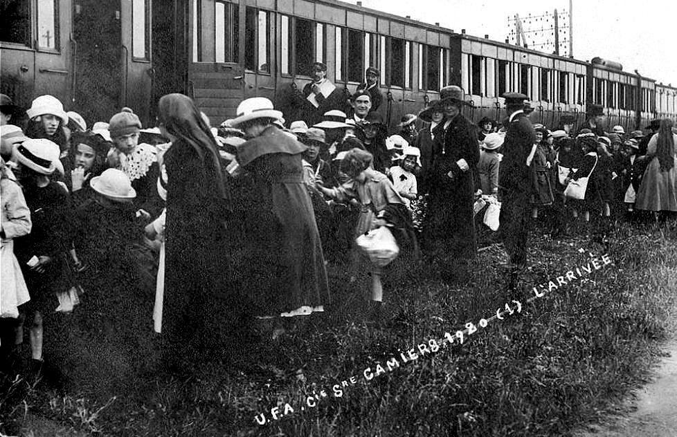 American children headed to camp generally did so by bus. The United States had an excellent rail system. Perhaps not as well developed as the major European systems, but still an excellent rail system. But my personal experience and much of the photographic record shows children heading off the camp by bus. This as best we can tell is not the case for France. We notice French children being transported by rail. We are not entirely sure why this was. It could be because France had a much better rail system. But the location of French summer camps was also probably a factor. We note many French summer camos located at populalar beach resorts. The were locations with excellent rail service because so many vacationers came there. American summer camps were primarily located in more isolated inland rural areas in the mountains are on lakes where the raul service was more likmited. We notice some coastal camps, often in estuary locations rather than at beach resorts. These are all areas that busses were needed to gets the kids to camp. Here we see a group of French girls arricing at a Channel beach resort in 1920 (figure 1).
