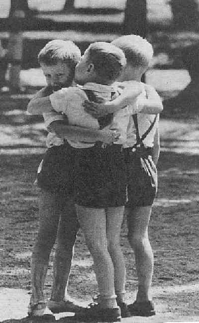 on one side or with shouderstraps (suspender shorts) for the younger boys. Blue or dark colors were the most common and they were worn with colored shirts. A European reader reports, "I am a bit astonished at the uniform clothing, I would have concluded that this is not a camp uniform, but that we have here a picture of triplets.