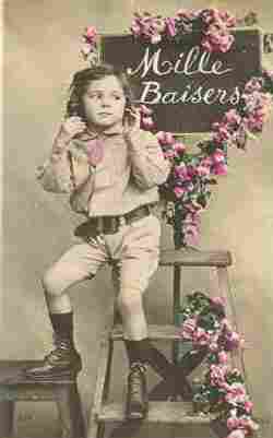 A popular style in France during the early-20 century was the shirt suit. This is a descriptive term we have created. we do not know if the frenh had a name for these outfits. We suspect that they were called a 'costume'. These were suits without a jacket or coat. Rather they were done with matching shirts as the top and without vests. The shirts were special shirts, done in the same material as the suit. This means a heavier material than usually used for shirts. We are not sure what was worn under the shirt suit top, perhaps a shirt waist. We are not sure becuse these suits were collar buttoning shirts so all we see is the collar which was the collar of the shirt suit top and not a standard shirt in lighter material worn underneath. Some boys did have detachable collars, suggesting a shirt waist worn underneath. The tops and bottoms of these suits were done in the same material and color. we notice both long sleeve tops and knee pnys bottoms. Our initial assessmenis that these suits were worn 1890s-1910s. We do not see them after World war I in the 1920s. and we are not sure hw cimmon these suits were. we see them more in postcards than ctual photographs. The age trends look to us to be bout 6-12 years of age. This was aEuropean style. We do not see these suits to anny extent in America, but se do see them kin oyher European countries.