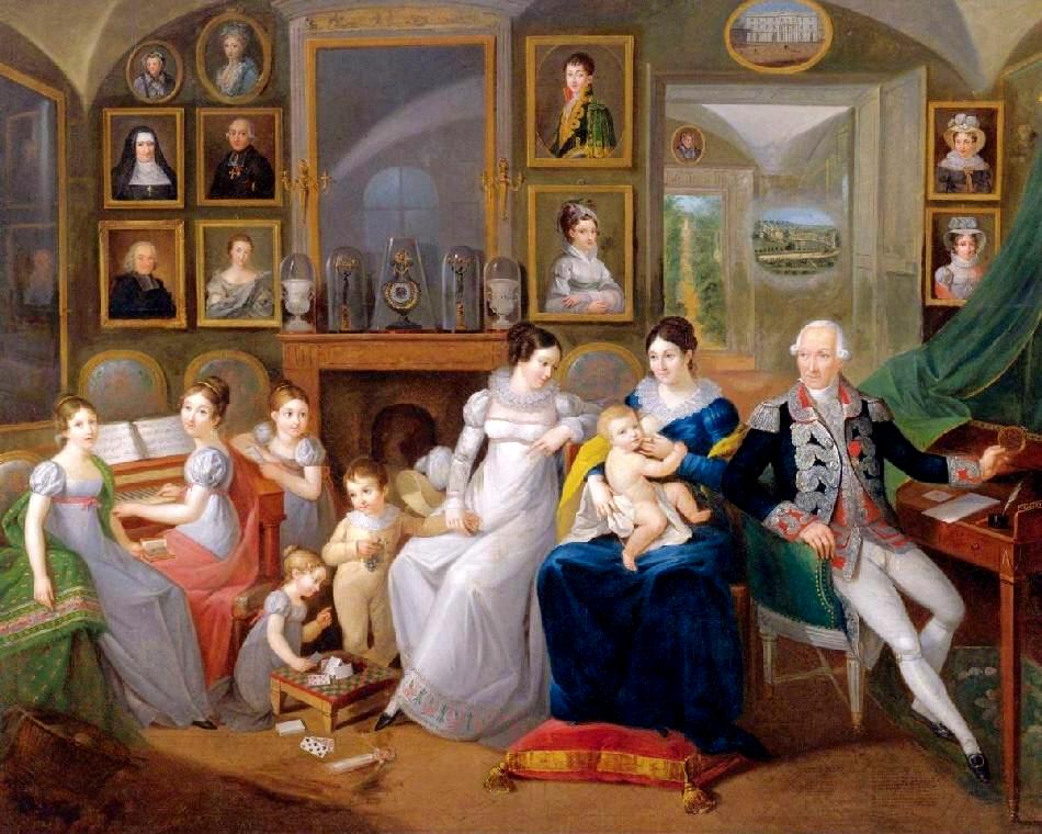 This French family portrait was painted by an unknown French arist, a competent but hardly not brilliant artist even though the Baron was reportedly rich. Gabriel de Froment, Baron de Castille, was reportedly born in a modest house in Uzès (1747). Uzès is a commune in the Gard department of southern France with a history dating back to the Galic (Celtic)-Roman times. It is located about 25 km north-northeast of Nîmes. His parents were Gabriël Joseph de Froment Baron van Castille en Argilliers (????-1773) and Maria Constance van la Vergne de Tressan. The Baron's family was of the minor French nobility, albeit with a long history. They did not have a family fortune or important family connections. The Baron was, however, enormously succeesful in life, although we do not have the details of his sucess. He managed to navigate the French Revolutionn (1789), a very dangerous time for aristocrats. He seems to have prospred during the Napoleonic era (1800-15) as well as the Bourbon Restoration (1814). He married the Princess Hermine Aline Dorothée de Rohan (1785-1843) 38 years his junior during the Napoleonic era (1809). Rohan is a commune in the Morbihan department in Brittany in north-western France. home to the House of Rohan. Family members included viscounts, dukes and princes who had a prominent role in French history. By the time this portrait was painted (1825), the Baron was 80 years old and lived in fairy-tale like castle. The Baron and his young wife are depicted along with the children. There is another young woman depicted. We do not know who she is perhaps a sister of th mother. We do not have a complete list of the children. Some of their children included: Marie Louise Taldérie Thérèse Meriadec de Froment (1811), Gabriel-Joseph de Froment-Fromentes, baron de Castille (1818), and Charlotte Louise Constance de Froment de Castille. Joseph's age calls the 1825 date of the portrait into question, suggesting alightly earlier date, perhaps 1922. Mother is nursing a baby. We are not sure how common this was. We are fairly sure that this was commonly shown in non-religious art--the baby Jesus being so commonly depicted in religious art. Rich people commonly hired nurse maids to do this. The French Revolution may have changed attitudes. The painting of course depicts a private scene, but a portrait like this one probably was be placed in a prominant room of the palace where guests could see the whole family. The six children were mostly girls. They wear empire dresses with baloon sleeves and orange waist bands. The girls are all dressed alike. weare not sure how common this was at the time or the social class conventions. The boy wears a classic skeleton suit with frilly collar. Note that is a bright color, yellow. The girls, however, all wear grey dresses. We thought that the fashions, especially his knee breeches suggested a somewhat early time, but give his aristocratic position perhaps the clothing was somewhat conservative. The Baron died a year after the portrait was painted (1826).