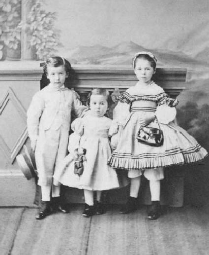 These French children had their CDV portrait taken in Metz, France during 1863. We see two little girls and their brother. The names are something like Louis, Maurice, and Lucie Pésardin. We at first thouht the name might be Réazatin. The handwriting is a little difficult to read. Louis and Maurice are boys. Lucie is a girl. Lucie wears a fashionable dresses with a cape-like top and plain panalettes. Unfortunately we do not know what colors the dress was. Maurice wears a plainer dress, but notice his side-parted hair. A French reader writes, "In 1863 when this portrait was taken, little boys less than 3 years old wore dresses and had their hair styled like little girls.