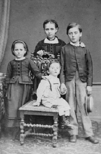 Here we see the four children of an unidentified Montbeliard family in the 1860s. There are four children, two boys and two girls. They blook about 2-11 years old. The girls wear dresses and the two boys wear suits. The CDV portrait was taken in Montbeliard, France. The boy holds a boater with a slightly brounded crown.